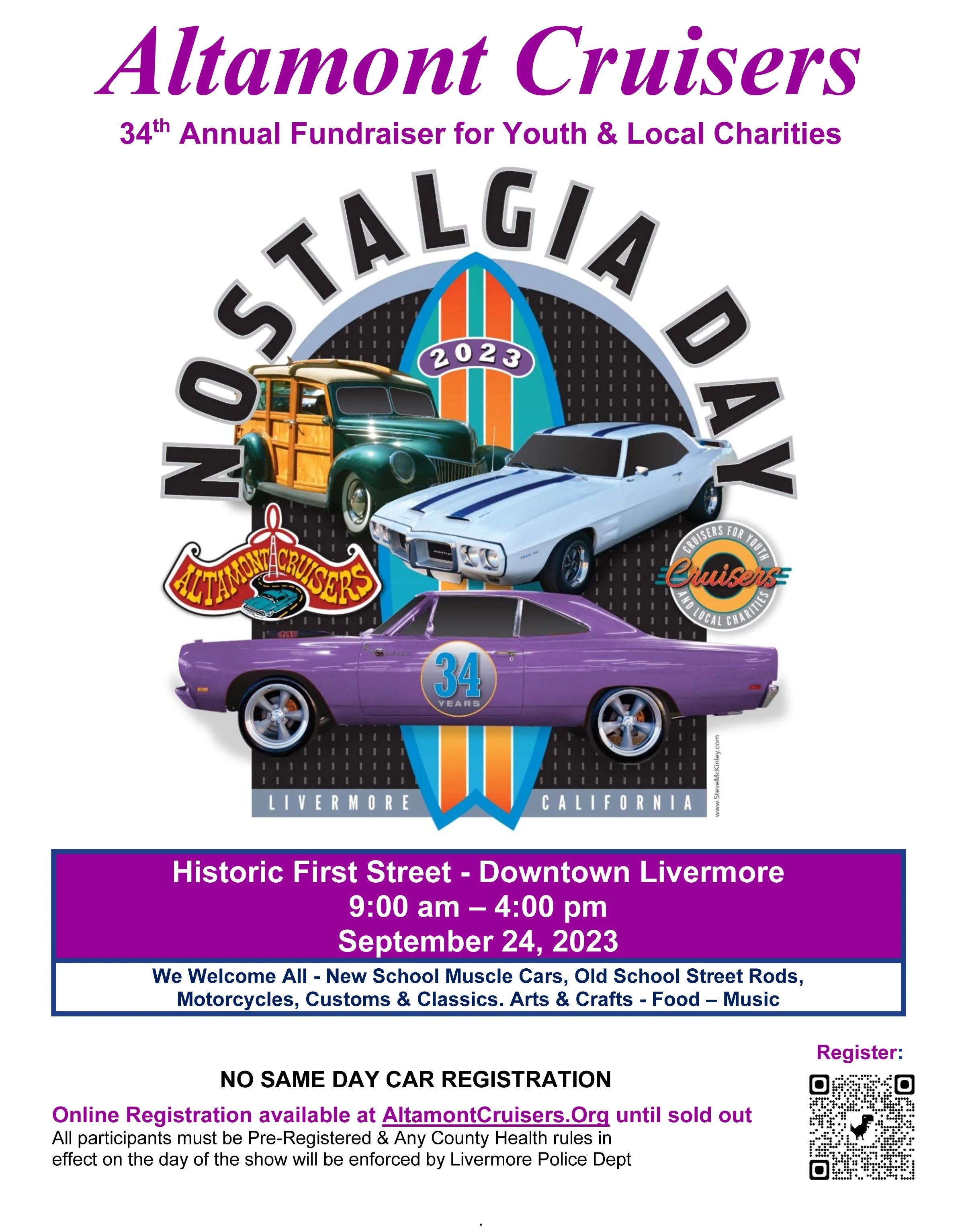 We are excited with the prospect of holding our 34th Annual Nostalgia Day Car Show on Sunday, September 24, 2023. As always, all of the proceeds from the show will go to local charities. This year, we hope to continue our tradition with another great show.