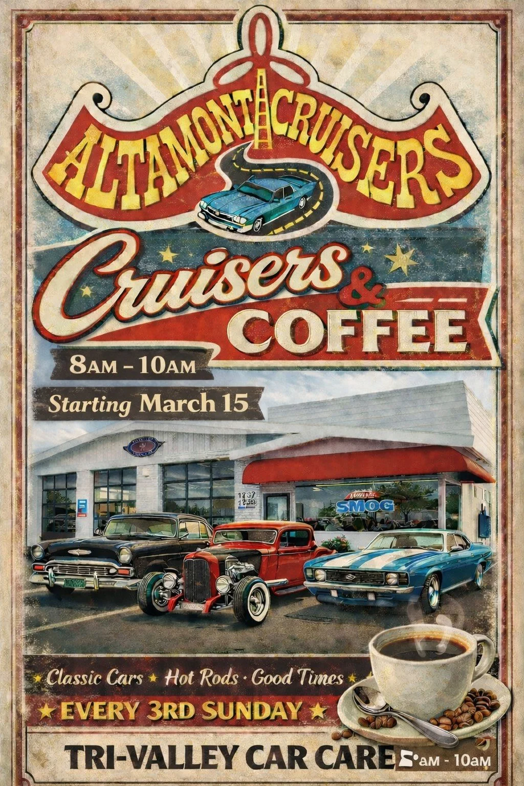 Our Cruisers & Coffee event is held between 8 am and 10 am on the third Sunday of each month between March and November (weather permitting) at Tri Valley Car Care in Livermore. Come enjoy the casual atmosphere and a cup of coffee with us.