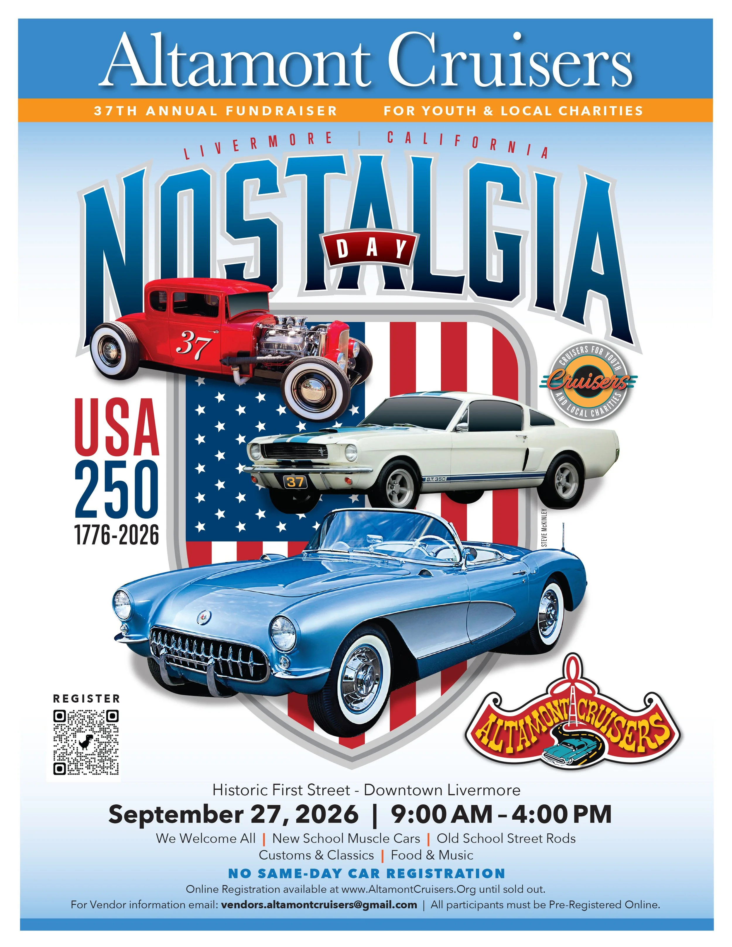 Thank you for your participation in our 37th Annual Nostalgia Day Car Show. Your support and participation in this special event enables the Altamont Cruisers to help many worthwhile charities. We hope that you will help us to continue this annual Livermore tradition in 2027.